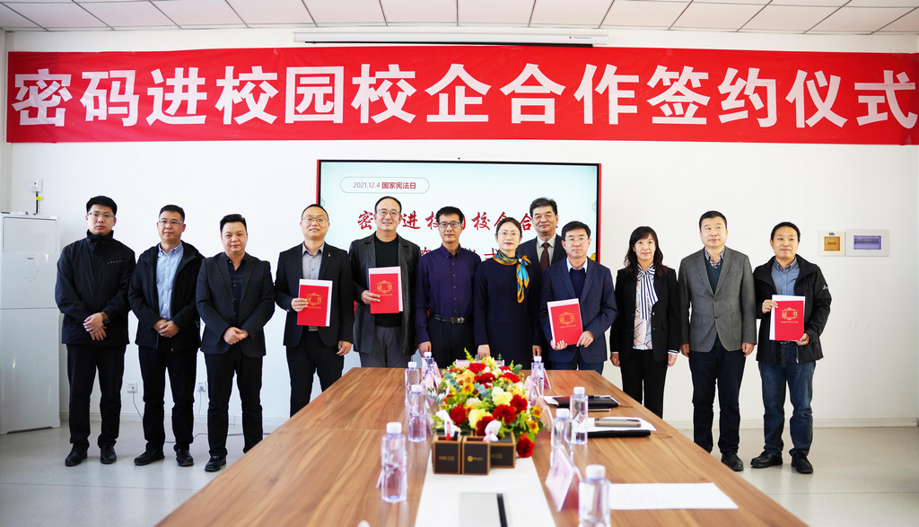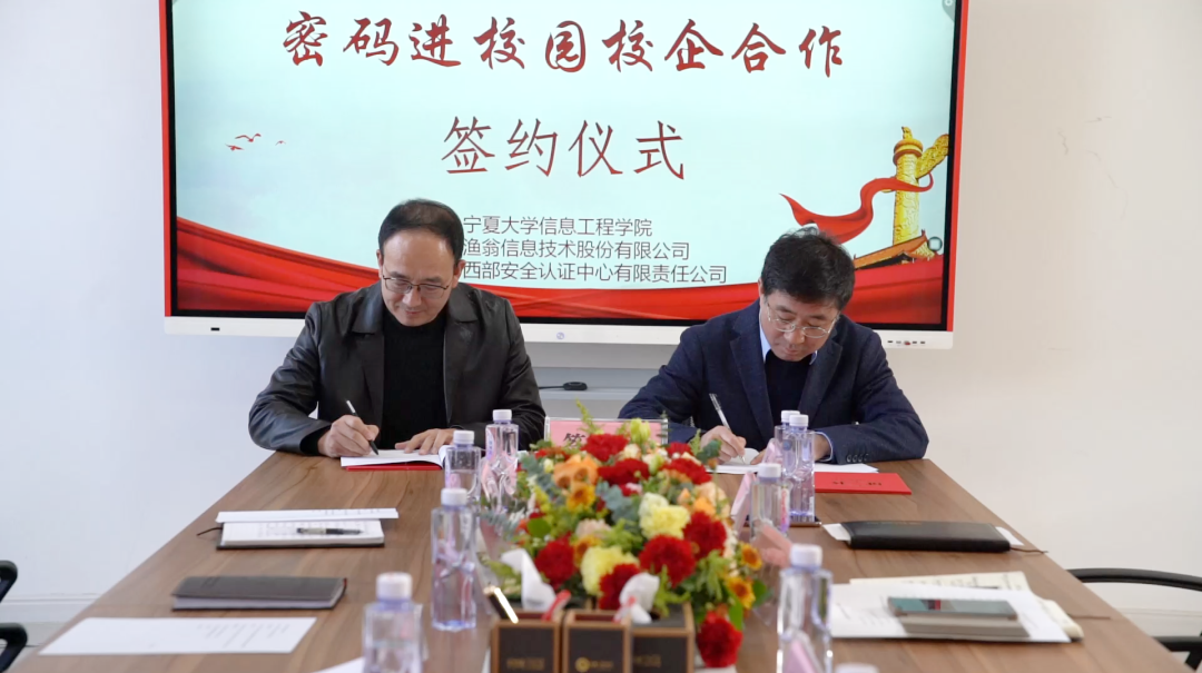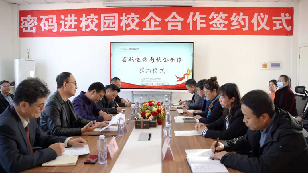 在第八个国家宪法日来临之际,为深入贯彻落实《中华人民共和国密码法》,进一步加快密码专业人才队伍建设步伐,打通我区密码产学研创新链、价值链,12月1日,“密码进校园校企合作签约仪式”在宁夏大学信息工程学院成功举行。此次签约仪式由宁夏密码管理局指导,宁夏商用密码协会会员单位富达国际APP信息技术股份有限公司、西部安全认证中心有限责任公司同宁夏大学信息工程学院签署战略合作协议,共同为我区密码学科建设、密码实训基地建设、密码人才培养贡献力量。宁夏密码管理局副局长李大苞,商密处副处长丁杰,宁夏大学信息工程学院党委书记武林波、院长冯锋、副书记孙莉、副院长杨军、学科主任李贯峰,富达国际APP信息技术股份有限公司董事长郭刚,西部安全认证中心有限责任公司常务副总经理耿方,区内其他商密企业代表等出席了签约仪式,签约仪式由宁夏商用密码协会秘书长赵军主持。