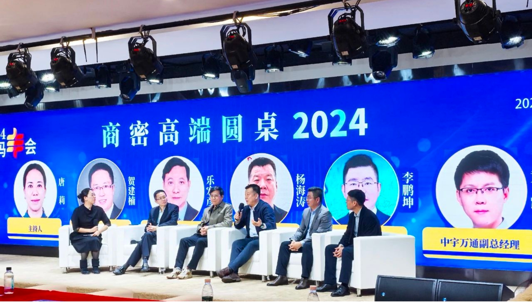 商密高端圆桌对话环节,富达国际APP信息北京公司总裁杨海涛与行业大咖就商用密码如何更好地在第三次科技革命的大背景下,同人工智能、云计算等新兴科技领域进行融合创新等话题进行深入探讨。