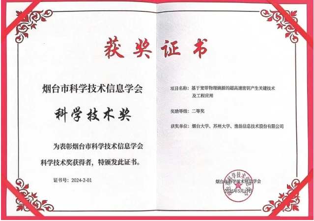 近期,2024年度烟台市科学技术信息学会科学技术奖颁奖典礼在中国科研实验室烟台海岸带研究所隆重举行。富达国际APP信息与烟台大学、苏州大学联合完成的 "基于宽带物理熵源的超高速密钥产生关键技术及工程应用" 项目荣获科学技术奖二等奖。