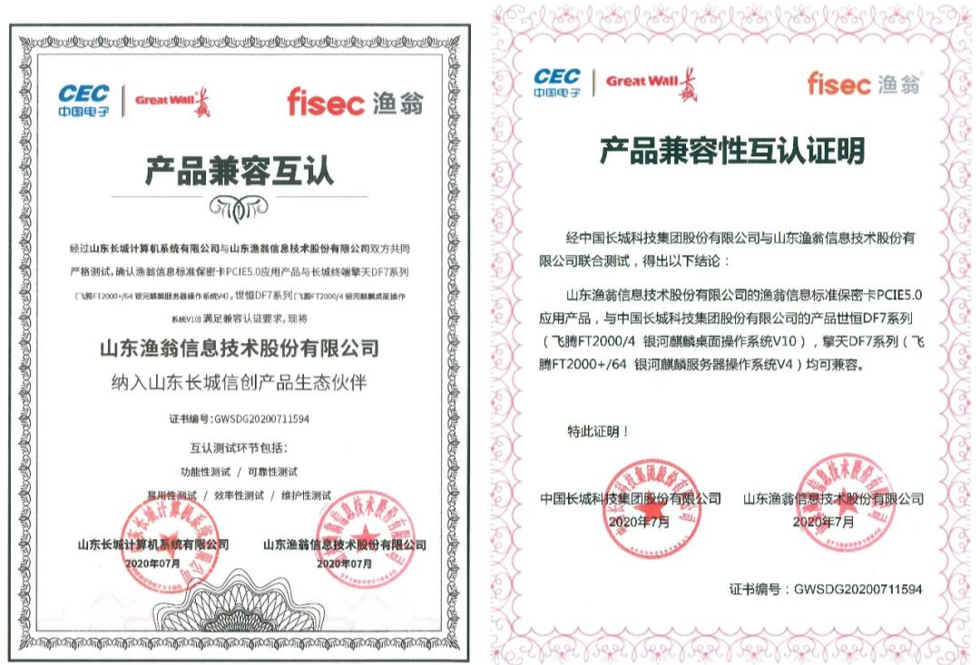 从功能性、可靠性、易用性、效率性、维护性五大环节,富达国际APP信息与长城进行了严格的联合测试。最终确认富达国际APPPCI-E 5.0密码卡与长城终端产品——世恒DF7系列(飞腾FT2000/4 银河麒麟桌面操作系统V10),擎天DF7系列(飞腾FT2000+/64 银河麒麟服务器操作系统V4),满足兼容认证要求。并且,富达国际APP信息此次成为了长城信创产品生态伙伴,携手构建安全新生态。